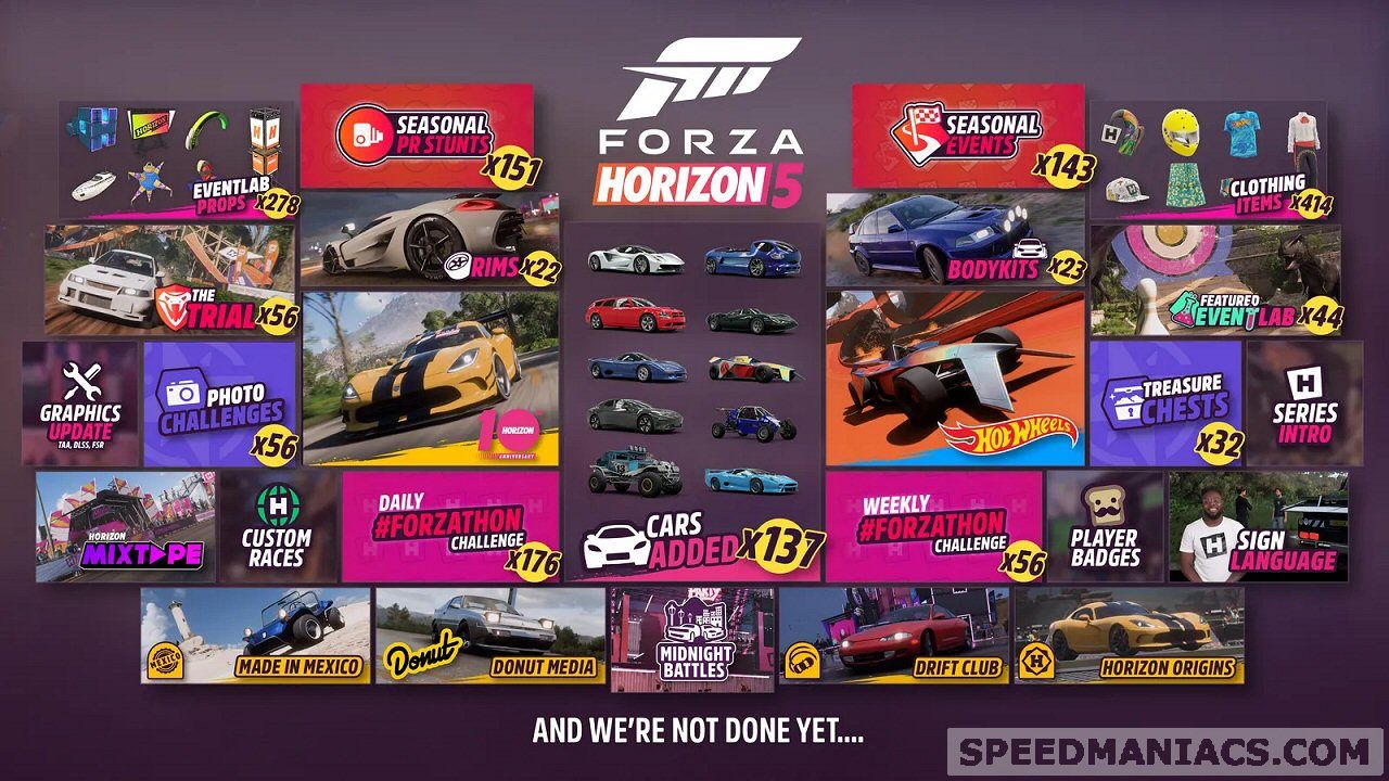 Willkommen zum Horizon Rush Takeover: Für Forza Horizon 5 ist das Series 5-Update verfügbar das neue Spielmöglichkeiten, neue Fahrzeuge und Verbesserungen mit sich bringt. Hier gibt es alle Details plus Infos welche der von der Community gemeldeten Probleme gelöst werden konnten.